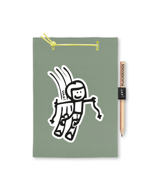 Blok A5 s vyměnitelnými papíry. Na přední straně možnost výběru z více než 300 potisků. Vyrobeno ze 100% bavlny. Výběr z 28 barev. Tiskneme ručním sítotiskem. V horní části blok A5 stažen žlutou gumičkou. 60 listů s perforací pro snadnější odtržení. Žlutá guma ve spodní části pro zajištění obalu. K bloku získáte i tužku #UAXDESIGN