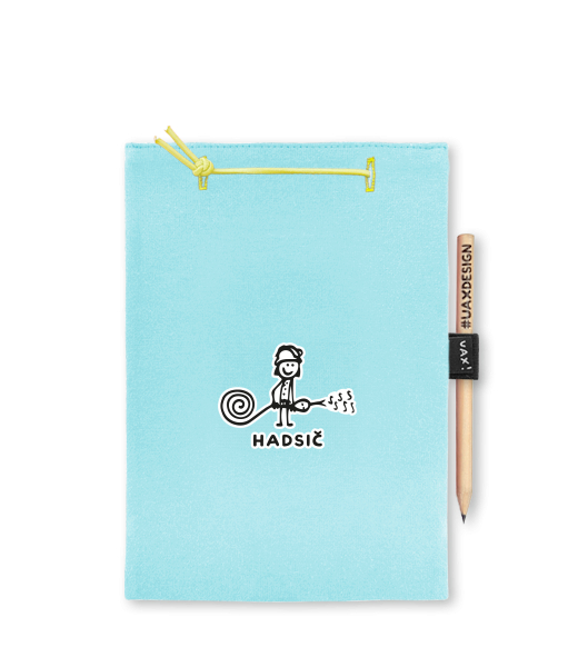 Blok A5 s vyměnitelnými papíry. Na přední straně možnost výběru z více než 300 potisků. Vyrobeno ze 100% bavlny. Výběr z 28 barev. Tiskneme ručním sítotiskem. V horní části blok A5 stažen žlutou gumičkou. 60 listů s perforací pro snadnější odtržení. Žlutá guma ve spodní části pro zajištění obalu. K bloku získáte i tužku #UAXDESIGN