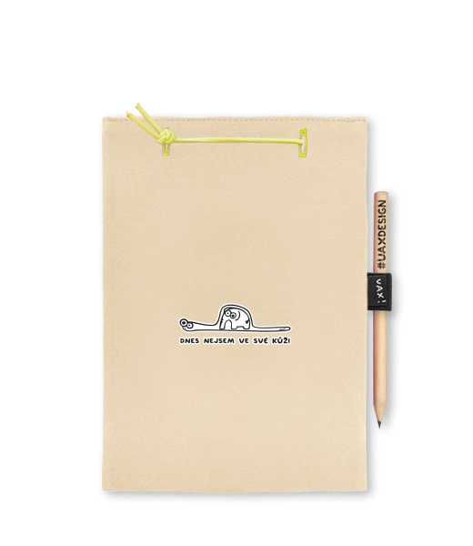 Blok A5 s vyměnitelnými papíry. Na přední straně možnost výběru z více než 300 potisků. Vyrobeno ze 100% bavlny. Výběr z 28 barev. Tiskneme ručním sítotiskem. V horní části blok A5 stažen žlutou gumičkou. 60 listů s perforací pro snadnější odtržení. Žlutá guma ve spodní části pro zajištění obalu. K bloku získáte i tužku #UAXDESIGN