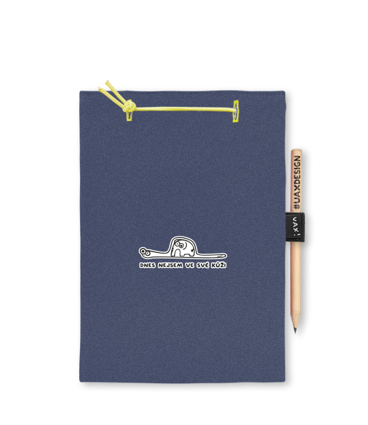 Blok A5 s vyměnitelnými papíry. Na přední straně možnost výběru z více než 300 potisků. Vyrobeno ze 100% bavlny. Výběr z 28 barev. Tiskneme ručním sítotiskem. V horní části blok A5 stažen žlutou gumičkou. 60 listů s perforací pro snadnější odtržení. Žlutá guma ve spodní části pro zajištění obalu. K bloku získáte i tužku #UAXDESIGN