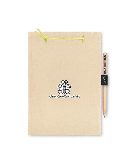 Blok A5 s vyměnitelnými papíry. Na přední straně možnost výběru z více než 300 potisků. Vyrobeno ze 100% bavlny. Výběr z 28 barev. Tiskneme ručním sítotiskem. V horní části blok A5 stažen žlutou gumičkou. 60 listů s perforací pro snadnější odtržení. Žlutá guma ve spodní části pro zajištění obalu. K bloku získáte i tužku #UAXDESIGN