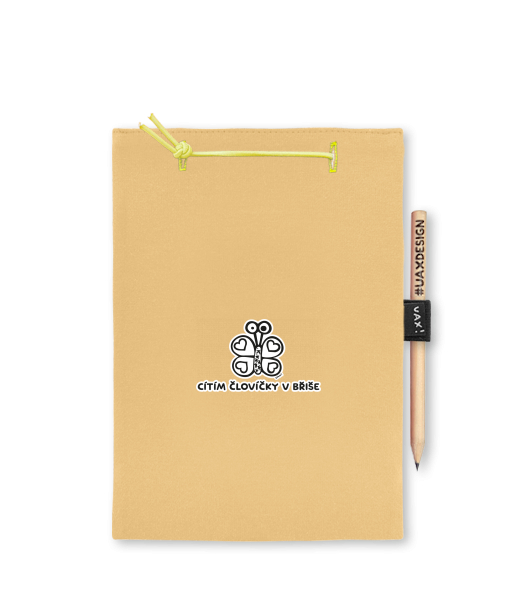 Blok A5 s vyměnitelnými papíry. Na přední straně možnost výběru z více než 300 potisků. Vyrobeno ze 100% bavlny. Výběr z 28 barev. Tiskneme ručním sítotiskem. V horní části blok A5 stažen žlutou gumičkou. 60 listů s perforací pro snadnější odtržení. Žlutá guma ve spodní části pro zajištění obalu. K bloku získáte i tužku #UAXDESIGN