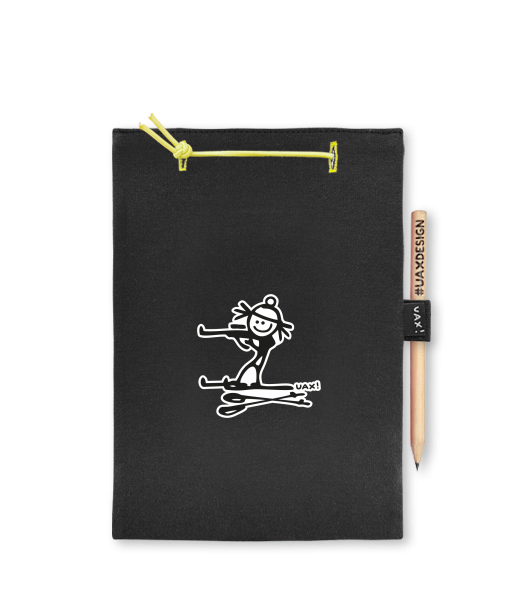 Blok A5 s vyměnitelnými papíry. Na přední straně možnost výběru z více než 300 potisků. Vyrobeno ze 100% bavlny. Výběr z 28 barev. Tiskneme ručním sítotiskem. V horní části blok A5 stažen žlutou gumičkou. 60 listů s perforací pro snadnější odtržení. Žlutá guma ve spodní části pro zajištění obalu. K bloku získáte i tužku #UAXDESIGN