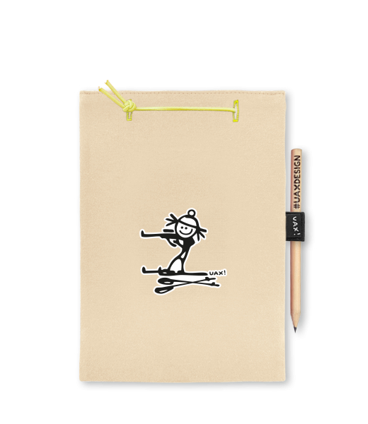Blok A5 s vyměnitelnými papíry. Na přední straně možnost výběru z více než 300 potisků. Vyrobeno ze 100% bavlny. Výběr z 28 barev. Tiskneme ručním sítotiskem. V horní části blok A5 stažen žlutou gumičkou. 60 listů s perforací pro snadnější odtržení. Žlutá guma ve spodní části pro zajištění obalu. K bloku získáte i tužku #UAXDESIGN