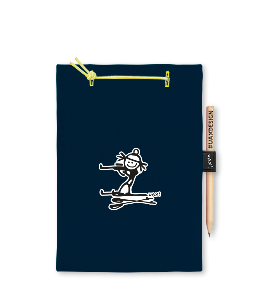Blok A5 s vyměnitelnými papíry. Na přední straně možnost výběru z více než 300 potisků. Vyrobeno ze 100% bavlny. Výběr z 28 barev. Tiskneme ručním sítotiskem. V horní části blok A5 stažen žlutou gumičkou. 60 listů s perforací pro snadnější odtržení. Žlutá guma ve spodní části pro zajištění obalu. K bloku získáte i tužku #UAXDESIGN