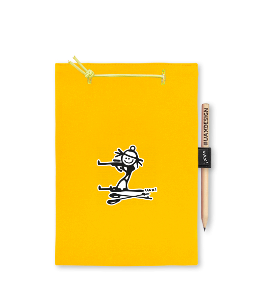 Blok A5 s vyměnitelnými papíry. Na přední straně možnost výběru z více než 300 potisků. Vyrobeno ze 100% bavlny. Výběr z 28 barev. Tiskneme ručním sítotiskem. V horní části blok A5 stažen žlutou gumičkou. 60 listů s perforací pro snadnější odtržení. Žlutá guma ve spodní části pro zajištění obalu. K bloku získáte i tužku #UAXDESIGN