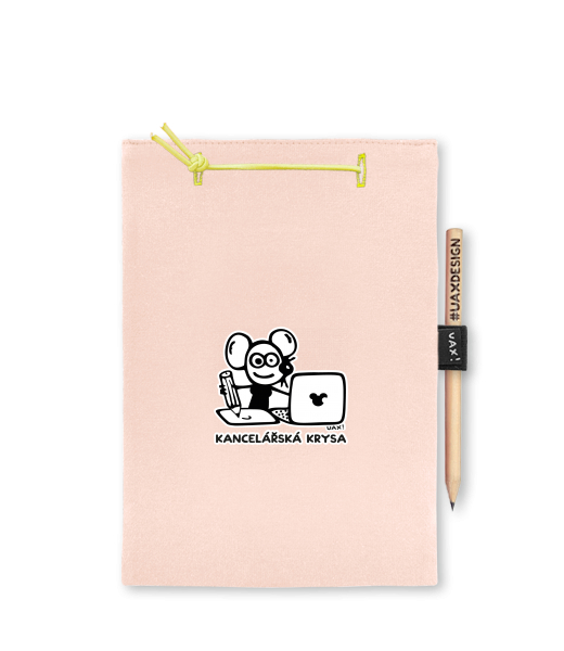 Blok A5 s vyměnitelnými papíry. Na přední straně možnost výběru z více než 300 potisků. Vyrobeno ze 100% bavlny. Výběr z 28 barev. Tiskneme ručním sítotiskem. V horní části blok A5 stažen žlutou gumičkou. 60 listů s perforací pro snadnější odtržení. Žlutá guma ve spodní části pro zajištění obalu. K bloku získáte i tužku #UAXDESIGN