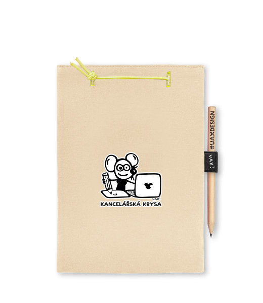 Blok A5 s vyměnitelnými papíry. Na přední straně možnost výběru z více než 300 potisků. Vyrobeno ze 100% bavlny. Výběr z 28 barev. Tiskneme ručním sítotiskem. V horní části blok A5 stažen žlutou gumičkou. 60 listů s perforací pro snadnější odtržení. Žlutá guma ve spodní části pro zajištění obalu. K bloku získáte i tužku #UAXDESIGN