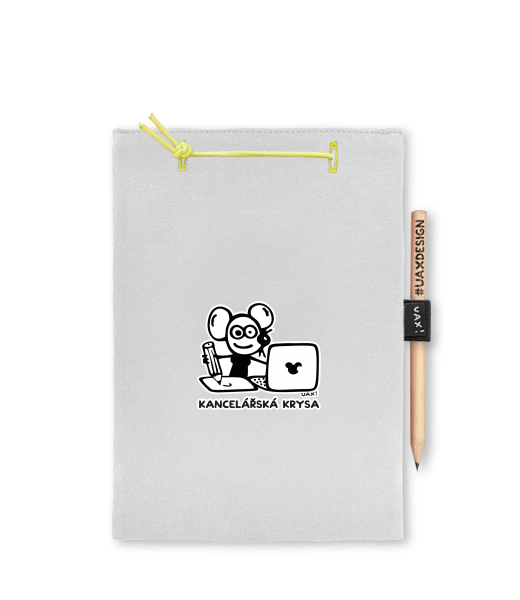 Blok A5 s vyměnitelnými papíry. Na přední straně možnost výběru z více než 300 potisků. Vyrobeno ze 100% bavlny. Výběr z 28 barev. Tiskneme ručním sítotiskem. V horní části blok A5 stažen žlutou gumičkou. 60 listů s perforací pro snadnější odtržení. Žlutá guma ve spodní části pro zajištění obalu. K bloku získáte i tužku #UAXDESIGN