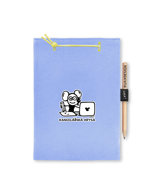 Blok A5 s vyměnitelnými papíry. Na přední straně možnost výběru z více než 300 potisků. Vyrobeno ze 100% bavlny. Výběr z 28 barev. Tiskneme ručním sítotiskem. V horní části blok A5 stažen žlutou gumičkou. 60 listů s perforací pro snadnější odtržení. Žlutá guma ve spodní části pro zajištění obalu. K bloku získáte i tužku #UAXDESIGN