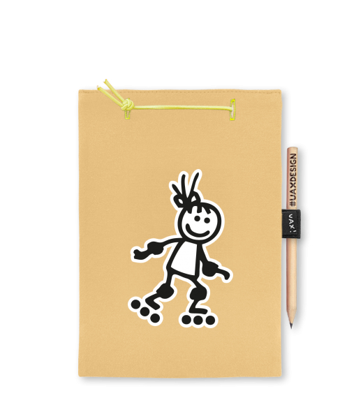 Blok A5 s vyměnitelnými papíry. Na přední straně možnost výběru z více než 300 potisků. Vyrobeno ze 100% bavlny. Výběr z 28 barev. Tiskneme ručním sítotiskem. V horní části blok A5 stažen žlutou gumičkou. 60 listů s perforací pro snadnější odtržení. Žlutá guma ve spodní části pro zajištění obalu. K bloku získáte i tužku #UAXDESIGN