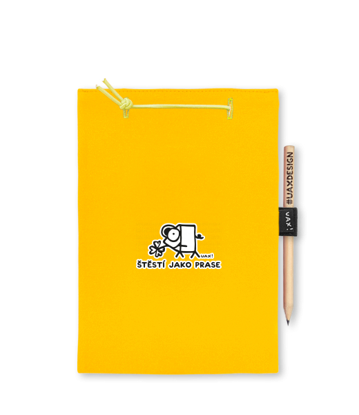 Blok A5 s vyměnitelnými papíry. Na přední straně možnost výběru z více než 300 potisků. Vyrobeno ze 100% bavlny. Výběr z 28 barev. Tiskneme ručním sítotiskem. V horní části blok A5 stažen žlutou gumičkou. 60 listů s perforací pro snadnější odtržení. Žlutá guma ve spodní části pro zajištění obalu. K bloku získáte i tužku #UAXDESIGN