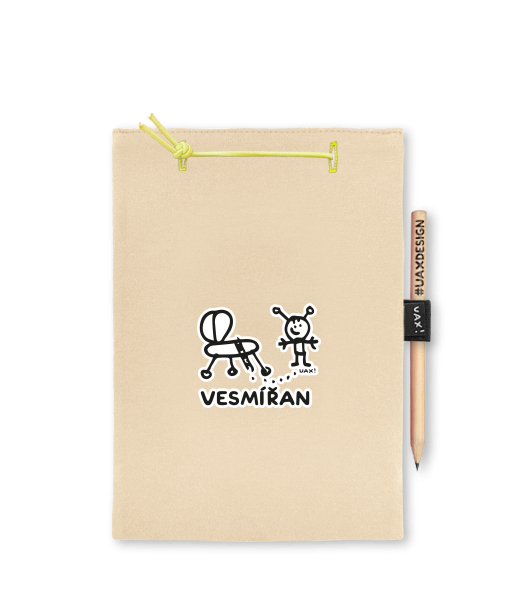 Blok A5 s vyměnitelnými papíry. Na přední straně možnost výběru z více než 300 potisků. Vyrobeno ze 100% bavlny. Výběr z 28 barev. Tiskneme ručním sítotiskem. V horní části blok A5 stažen žlutou gumičkou. 60 listů s perforací pro snadnější odtržení. Žlutá guma ve spodní části pro zajištění obalu. K bloku získáte i tužku #UAXDESIGN