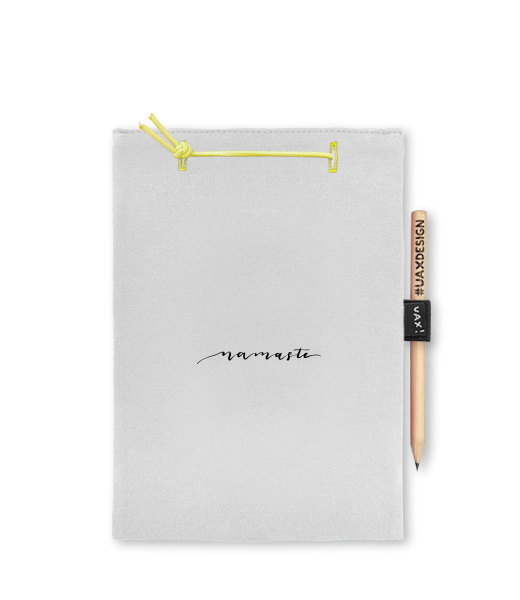 Blok A5 s vyměnitelnými papíry. Na přední straně možnost výběru z více než 300 potisků. Vyrobeno ze 100% bavlny. Výběr z 28 barev. Tiskneme ručním sítotiskem. V horní části blok A5 stažen žlutou gumičkou. 60 listů s perforací pro snadnější odtržení. Žlutá guma ve spodní části pro zajištění obalu. K bloku získáte i tužku #UAXDESIGN