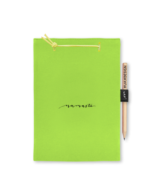 Blok A5 s vyměnitelnými papíry. Na přední straně možnost výběru z více než 300 potisků. Vyrobeno ze 100% bavlny. Výběr z 28 barev. Tiskneme ručním sítotiskem. V horní části blok A5 stažen žlutou gumičkou. 60 listů s perforací pro snadnější odtržení. Žlutá guma ve spodní části pro zajištění obalu. K bloku získáte i tužku #UAXDESIGN