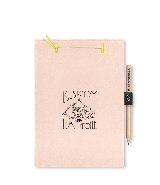Blok A5 s vyměnitelnými papíry. Na přední straně možnost výběru z více než 300 potisků. Vyrobeno ze 100% bavlny. Výběr z 28 barev. Tiskneme ručním sítotiskem. V horní části blok A5 stažen žlutou gumičkou. 60 listů s perforací pro snadnější odtržení. Žlutá guma ve spodní části pro zajištění obalu. K bloku získáte i tužku #UAXDESIGN