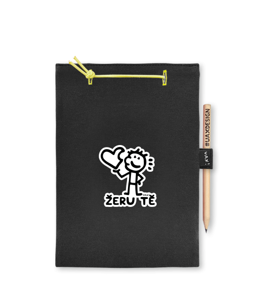 Blok A5 s vyměnitelnými papíry. Na přední straně možnost výběru z více než 300 potisků. Vyrobeno ze 100% bavlny. Výběr z 28 barev. Tiskneme ručním sítotiskem. V horní části blok A5 stažen žlutou gumičkou. 60 listů s perforací pro snadnější odtržení. Žlutá guma ve spodní části pro zajištění obalu. K bloku získáte i tužku #UAXDESIGN