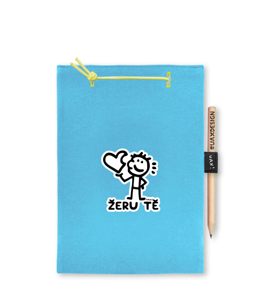 Blok A5 s vyměnitelnými papíry. Na přední straně možnost výběru z více než 300 potisků. Vyrobeno ze 100% bavlny. Výběr z 28 barev. Tiskneme ručním sítotiskem. V horní části blok A5 stažen žlutou gumičkou. 60 listů s perforací pro snadnější odtržení. Žlutá guma ve spodní části pro zajištění obalu. K bloku získáte i tužku #UAXDESIGN