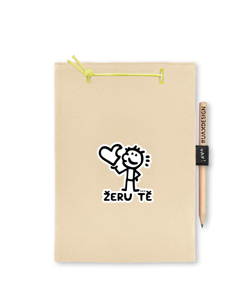 Blok A5 s vyměnitelnými papíry. Na přední straně možnost výběru z více než 300 potisků. Vyrobeno ze 100% bavlny. Výběr z 28 barev. Tiskneme ručním sítotiskem. V horní části blok A5 stažen žlutou gumičkou. 60 listů s perforací pro snadnější odtržení. Žlutá guma ve spodní části pro zajištění obalu. K bloku získáte i tužku #UAXDESIGN
