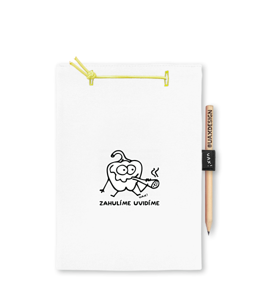 Blok A5 s vyměnitelnými papíry. Na přední straně možnost výběru z více než 300 potisků. Vyrobeno ze 100% bavlny. Výběr z 28 barev. Tiskneme ručním sítotiskem. V horní části blok A5 stažen žlutou gumičkou. 60 listů s perforací pro snadnější odtržení. Žlutá guma ve spodní části pro zajištění obalu. K bloku získáte i tužku #UAXDESIGN