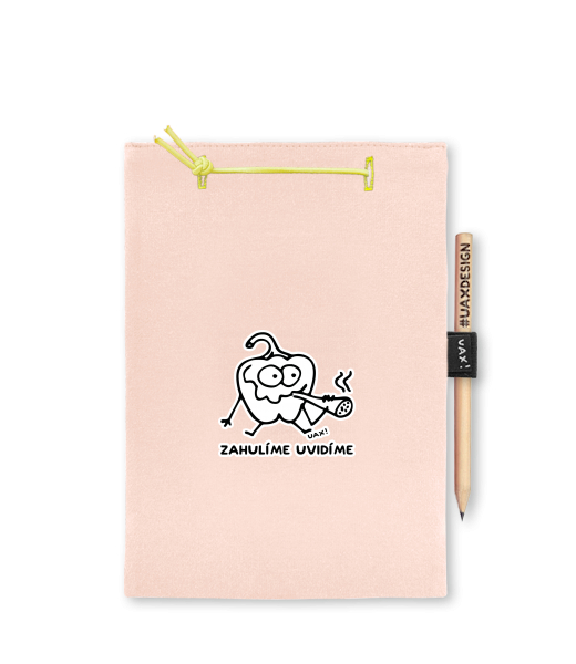 Blok A5 s vyměnitelnými papíry. Na přední straně možnost výběru z více než 300 potisků. Vyrobeno ze 100% bavlny. Výběr z 28 barev. Tiskneme ručním sítotiskem. V horní části blok A5 stažen žlutou gumičkou. 60 listů s perforací pro snadnější odtržení. Žlutá guma ve spodní části pro zajištění obalu. K bloku získáte i tužku #UAXDESIGN
