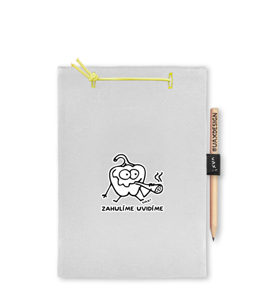 Blok A5 s vyměnitelnými papíry. Na přední straně možnost výběru z více než 300 potisků. Vyrobeno ze 100% bavlny. Výběr z 28 barev. Tiskneme ručním sítotiskem. V horní části blok A5 stažen žlutou gumičkou. 60 listů s perforací pro snadnější odtržení. Žlutá guma ve spodní části pro zajištění obalu. K bloku získáte i tužku #UAXDESIGN