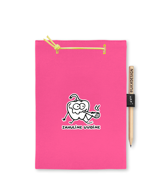 Blok A5 s vyměnitelnými papíry. Na přední straně možnost výběru z více než 300 potisků. Vyrobeno ze 100% bavlny. Výběr z 28 barev. Tiskneme ručním sítotiskem. V horní části blok A5 stažen žlutou gumičkou. 60 listů s perforací pro snadnější odtržení. Žlutá guma ve spodní části pro zajištění obalu. K bloku získáte i tužku #UAXDESIGN