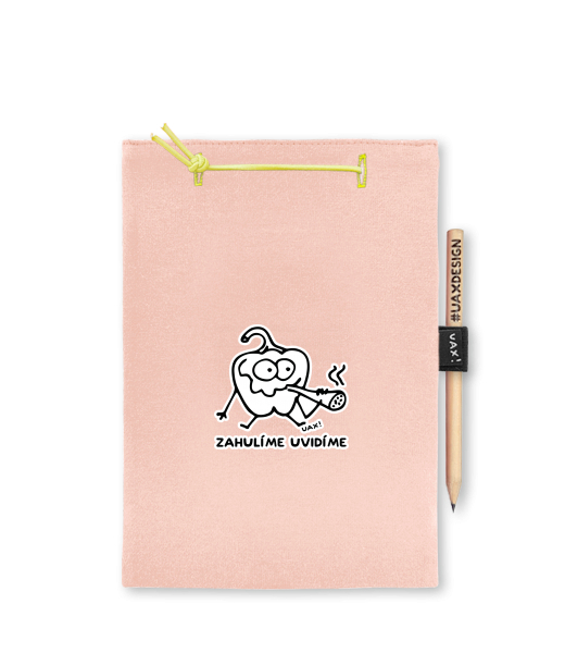 Blok A5 s vyměnitelnými papíry. Na přední straně možnost výběru z více než 300 potisků. Vyrobeno ze 100% bavlny. Výběr z 28 barev. Tiskneme ručním sítotiskem. V horní části blok A5 stažen žlutou gumičkou. 60 listů s perforací pro snadnější odtržení. Žlutá guma ve spodní části pro zajištění obalu. K bloku získáte i tužku #UAXDESIGN