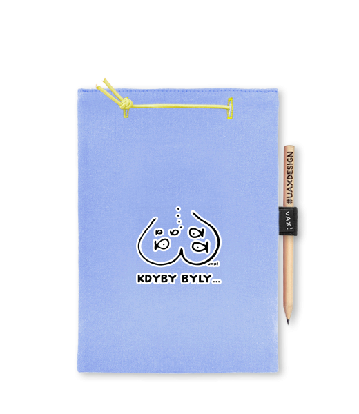 Blok A5 s vyměnitelnými papíry. Na přední straně možnost výběru z více než 300 potisků. Vyrobeno ze 100% bavlny. Výběr z 28 barev. Tiskneme ručním sítotiskem. V horní části blok A5 stažen žlutou gumičkou. 60 listů s perforací pro snadnější odtržení. Žlutá guma ve spodní části pro zajištění obalu. K bloku získáte i tužku #UAXDESIGN