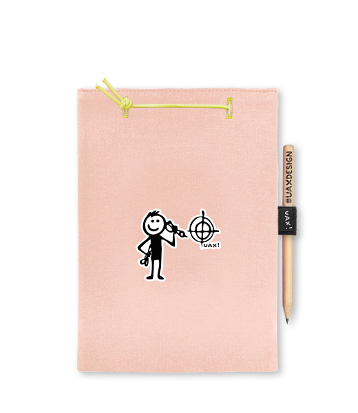 Blok A5 s vyměnitelnými papíry. Na přední straně možnost výběru z více než 300 potisků. Vyrobeno ze 100% bavlny. Výběr z 28 barev. Tiskneme ručním sítotiskem. V horní části blok A5 stažen žlutou gumičkou. 60 listů s perforací pro snadnější odtržení. Žlutá guma ve spodní části pro zajištění obalu. K bloku získáte i tužku #UAXDESIGN