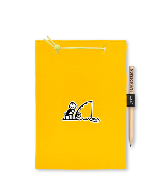 Blok A5 s vyměnitelnými papíry. Na přední straně možnost výběru z více než 300 potisků. Vyrobeno ze 100% bavlny. Výběr z 28 barev. Tiskneme ručním sítotiskem. V horní části blok A5 stažen žlutou gumičkou. 60 listů s perforací pro snadnější odtržení. Žlutá guma ve spodní části pro zajištění obalu. K bloku získáte i tužku #UAXDESIGN