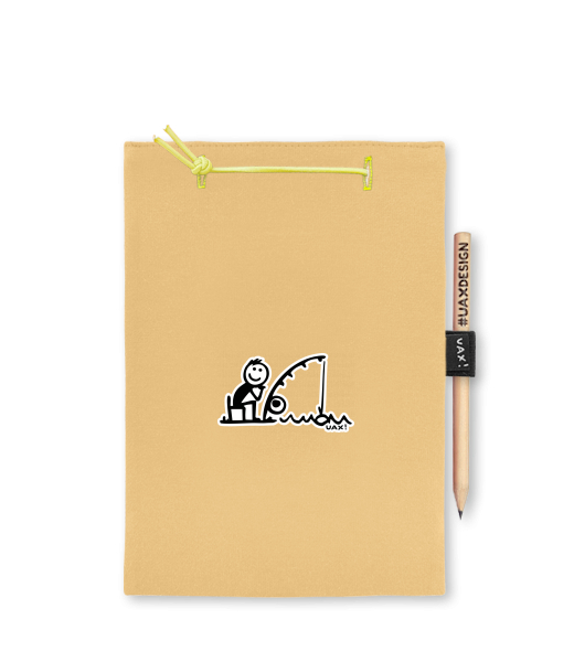 Blok A5 s vyměnitelnými papíry. Na přední straně možnost výběru z více než 300 potisků. Vyrobeno ze 100% bavlny. Výběr z 28 barev. Tiskneme ručním sítotiskem. V horní části blok A5 stažen žlutou gumičkou. 60 listů s perforací pro snadnější odtržení. Žlutá guma ve spodní části pro zajištění obalu. K bloku získáte i tužku #UAXDESIGN