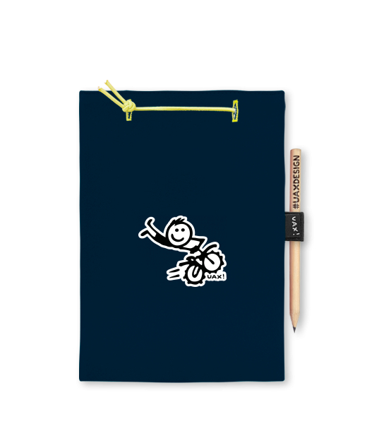 Blok A5 s vyměnitelnými papíry. Na přední straně možnost výběru z více než 300 potisků. Vyrobeno ze 100% bavlny. Výběr z 28 barev. Tiskneme ručním sítotiskem. V horní části blok A5 stažen žlutou gumičkou. 60 listů s perforací pro snadnější odtržení. Žlutá guma ve spodní části pro zajištění obalu. K bloku získáte i tužku #UAXDESIGN