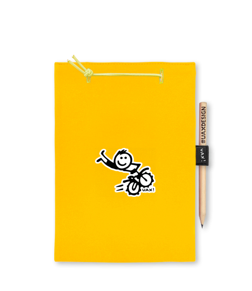 Blok A5 s vyměnitelnými papíry. Na přední straně možnost výběru z více než 300 potisků. Vyrobeno ze 100% bavlny. Výběr z 28 barev. Tiskneme ručním sítotiskem. V horní části blok A5 stažen žlutou gumičkou. 60 listů s perforací pro snadnější odtržení. Žlutá guma ve spodní části pro zajištění obalu. K bloku získáte i tužku #UAXDESIGN