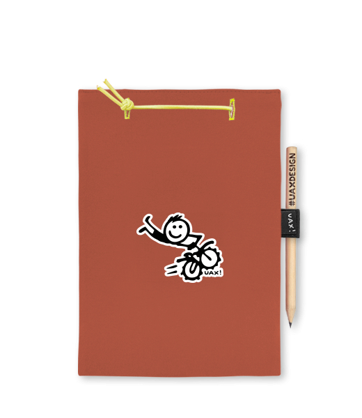 Blok A5 s vyměnitelnými papíry. Na přední straně možnost výběru z více než 300 potisků. Vyrobeno ze 100% bavlny. Výběr z 28 barev. Tiskneme ručním sítotiskem. V horní části blok A5 stažen žlutou gumičkou. 60 listů s perforací pro snadnější odtržení. Žlutá guma ve spodní části pro zajištění obalu. K bloku získáte i tužku #UAXDESIGN