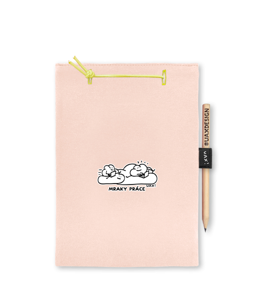 Blok A5 s vyměnitelnými papíry. Na přední straně možnost výběru z více než 300 potisků. Vyrobeno ze 100% bavlny. Výběr z 28 barev. Tiskneme ručním sítotiskem. V horní části blok A5 stažen žlutou gumičkou. 60 listů s perforací pro snadnější odtržení. Žlutá guma ve spodní části pro zajištění obalu. K bloku získáte i tužku #UAXDESIGN