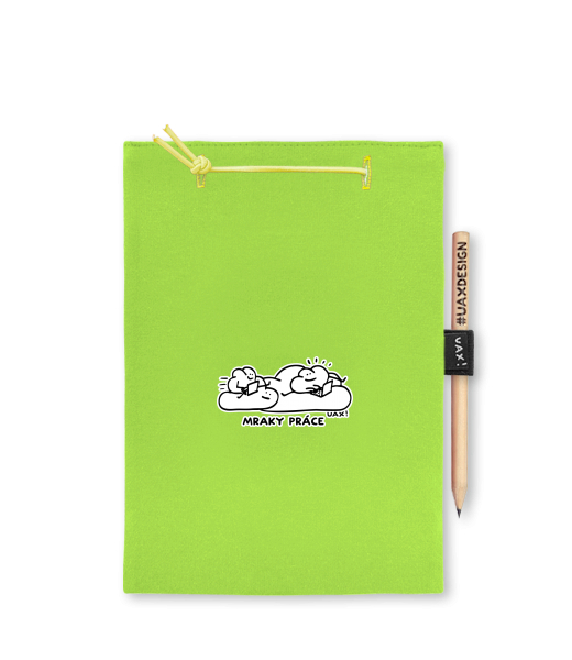 Blok A5 s vyměnitelnými papíry. Na přední straně možnost výběru z více než 300 potisků. Vyrobeno ze 100% bavlny. Výběr z 28 barev. Tiskneme ručním sítotiskem. V horní části blok A5 stažen žlutou gumičkou. 60 listů s perforací pro snadnější odtržení. Žlutá guma ve spodní části pro zajištění obalu. K bloku získáte i tužku #UAXDESIGN