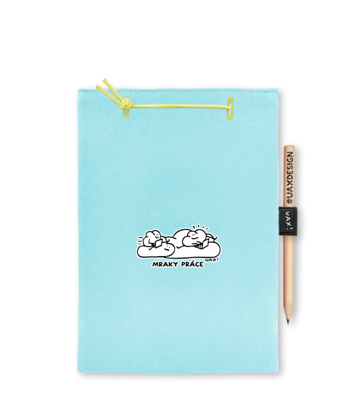 Blok A5 s vyměnitelnými papíry. Na přední straně možnost výběru z více než 300 potisků. Vyrobeno ze 100% bavlny. Výběr z 28 barev. Tiskneme ručním sítotiskem. V horní části blok A5 stažen žlutou gumičkou. 60 listů s perforací pro snadnější odtržení. Žlutá guma ve spodní části pro zajištění obalu. K bloku získáte i tužku #UAXDESIGN