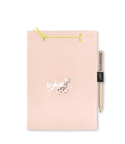 Blok A5 s vyměnitelnými papíry. Na přední straně možnost výběru z více než 300 potisků. Vyrobeno ze 100% bavlny. Výběr z 28 barev. Tiskneme ručním sítotiskem. V horní části blok A5 stažen žlutou gumičkou. 60 listů s perforací pro snadnější odtržení. Žlutá guma ve spodní části pro zajištění obalu. K bloku získáte i tužku #UAXDESIGN