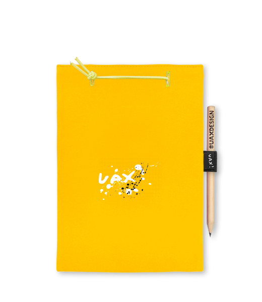 Blok A5 s vyměnitelnými papíry. Na přední straně možnost výběru z více než 300 potisků. Vyrobeno ze 100% bavlny. Výběr z 28 barev. Tiskneme ručním sítotiskem. V horní části blok A5 stažen žlutou gumičkou. 60 listů s perforací pro snadnější odtržení. Žlutá guma ve spodní části pro zajištění obalu. K bloku získáte i tužku #UAXDESIGN