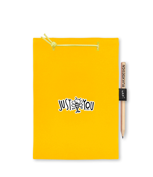 Blok A5 s vyměnitelnými papíry. Na přední straně možnost výběru z více než 300 potisků. Vyrobeno ze 100% bavlny. Výběr z 28 barev. Tiskneme ručním sítotiskem. V horní části blok A5 stažen žlutou gumičkou. 60 listů s perforací pro snadnější odtržení. Žlutá guma ve spodní části pro zajištění obalu. K bloku získáte i tužku #UAXDESIGN