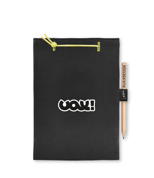 Blok A5 s vyměnitelnými papíry. Na přední straně možnost výběru z více než 300 potisků. Vyrobeno ze 100% bavlny. Výběr z 28 barev. Tiskneme ručním sítotiskem. V horní části blok A5 stažen žlutou gumičkou. 60 listů s perforací pro snadnější odtržení. Žlutá guma ve spodní části pro zajištění obalu. K bloku získáte i tužku #UAXDESIGN