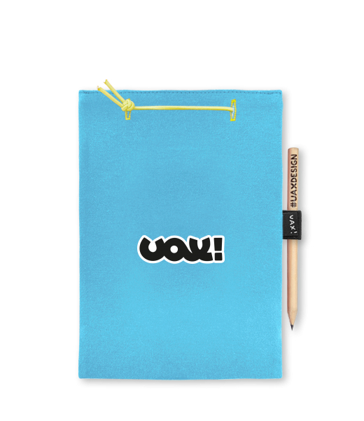 Blok A5 s vyměnitelnými papíry. Na přední straně možnost výběru z více než 300 potisků. Vyrobeno ze 100% bavlny. Výběr z 28 barev. Tiskneme ručním sítotiskem. V horní části blok A5 stažen žlutou gumičkou. 60 listů s perforací pro snadnější odtržení. Žlutá guma ve spodní části pro zajištění obalu. K bloku získáte i tužku #UAXDESIGN