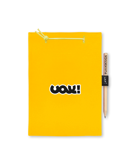 Blok A5 s vyměnitelnými papíry. Na přední straně možnost výběru z více než 300 potisků. Vyrobeno ze 100% bavlny. Výběr z 28 barev. Tiskneme ručním sítotiskem. V horní části blok A5 stažen žlutou gumičkou. 60 listů s perforací pro snadnější odtržení. Žlutá guma ve spodní části pro zajištění obalu. K bloku získáte i tužku #UAXDESIGN