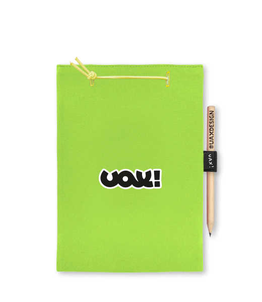 Blok A5 s vyměnitelnými papíry. Na přední straně možnost výběru z více než 300 potisků. Vyrobeno ze 100% bavlny. Výběr z 28 barev. Tiskneme ručním sítotiskem. V horní části blok A5 stažen žlutou gumičkou. 60 listů s perforací pro snadnější odtržení. Žlutá guma ve spodní části pro zajištění obalu. K bloku získáte i tužku #UAXDESIGN