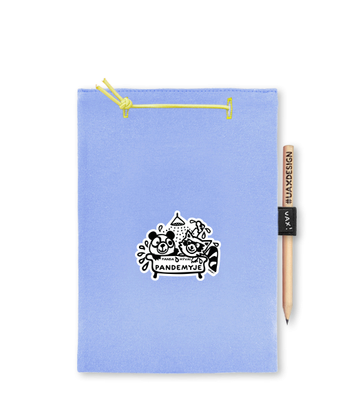 Blok A5 s vyměnitelnými papíry. Na přední straně možnost výběru z více než 300 potisků. Vyrobeno ze 100% bavlny. Výběr z 28 barev. Tiskneme ručním sítotiskem. V horní části blok A5 stažen žlutou gumičkou. 60 listů s perforací pro snadnější odtržení. Žlutá guma ve spodní části pro zajištění obalu. K bloku získáte i tužku #UAXDESIGN