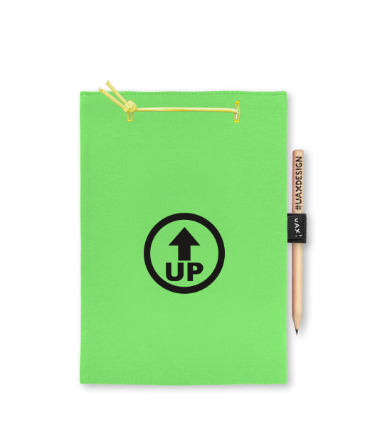 Blok A5 s vyměnitelnými papíry. Na přední straně možnost výběru z více než 300 potisků. Vyrobeno ze 100% bavlny. Výběr z 28 barev. Tiskneme ručním sítotiskem. V horní části blok A5 stažen žlutou gumičkou. 60 listů s perforací pro snadnější odtržení. Žlutá guma ve spodní části pro zajištění obalu. K bloku získáte i tužku #UAXDESIGN