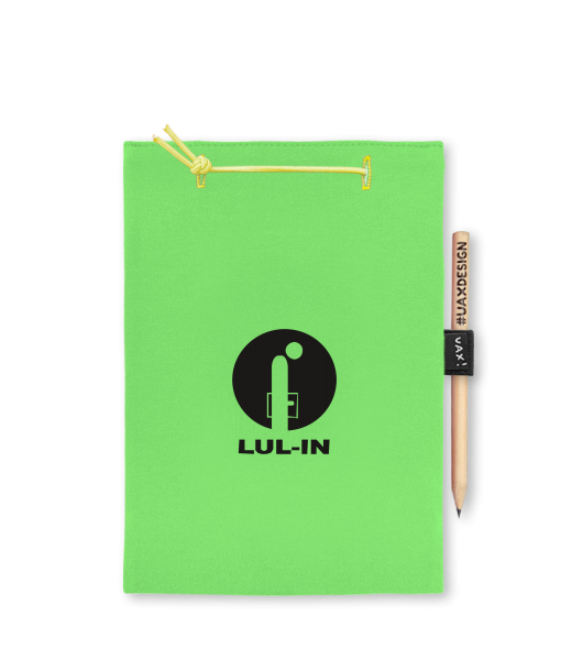 Blok A5 s vyměnitelnými papíry. Na přední straně možnost výběru z více než 300 potisků. Vyrobeno ze 100% bavlny. Výběr z 28 barev. Tiskneme ručním sítotiskem. V horní části blok A5 stažen žlutou gumičkou. 60 listů s perforací pro snadnější odtržení. Žlutá guma ve spodní části pro zajištění obalu. K bloku získáte i tužku #UAXDESIGN