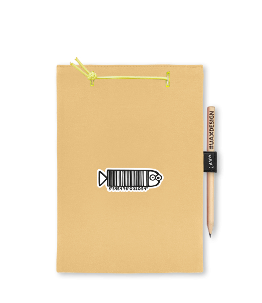 Blok A5 s vyměnitelnými papíry. Na přední straně možnost výběru z více než 300 potisků. Vyrobeno ze 100% bavlny. Výběr z 28 barev. Tiskneme ručním sítotiskem. V horní části blok A5 stažen žlutou gumičkou. 60 listů s perforací pro snadnější odtržení. Žlutá guma ve spodní části pro zajištění obalu. K bloku získáte i tužku #UAXDESIGN