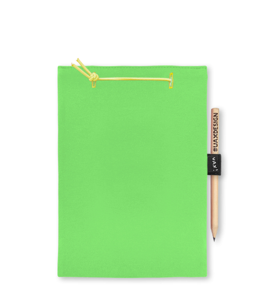 Blok A5 s vyměnitelnými papíry. Na přední straně možnost výběru z více než 300 potisků. Vyrobeno ze 100% bavlny. Výběr z 28 barev. Tiskneme ručním sítotiskem. V horní části blok A5 stažen žlutou gumičkou. 60 listů s perforací pro snadnější odtržení. Žlutá guma ve spodní části pro zajištění obalu. K bloku získáte i tužku #UAXDESIGN